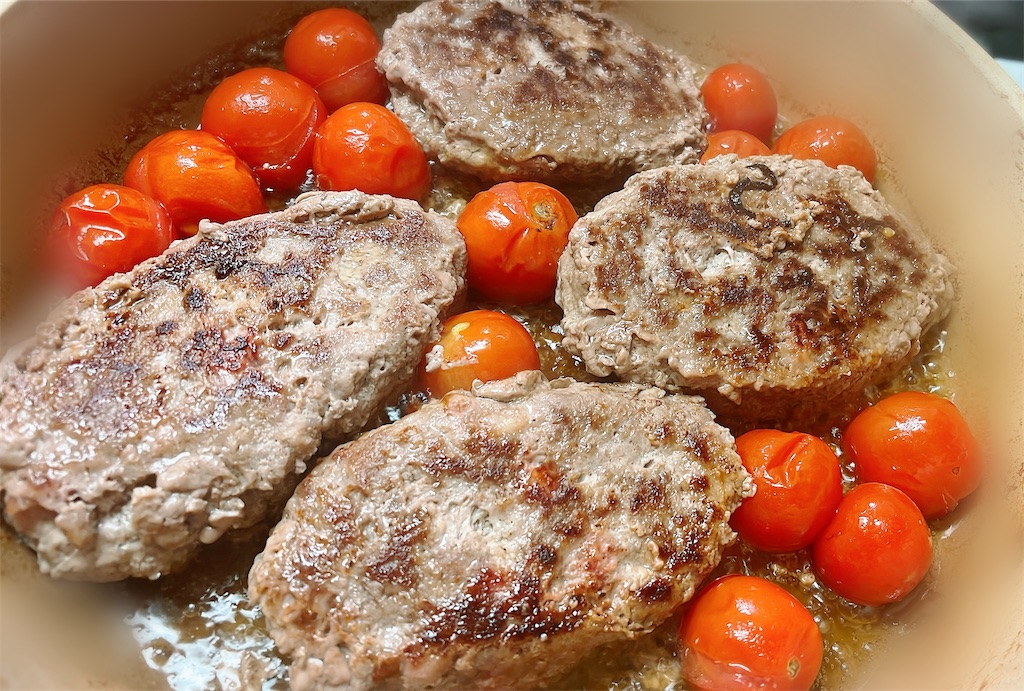 ❸ハンバーグとミニトマトを器に盛り付け、フライパンに残った汁をかけて完成。(ミニトマトを潰してハンバーグと一緒に食べるのがおすすめです。